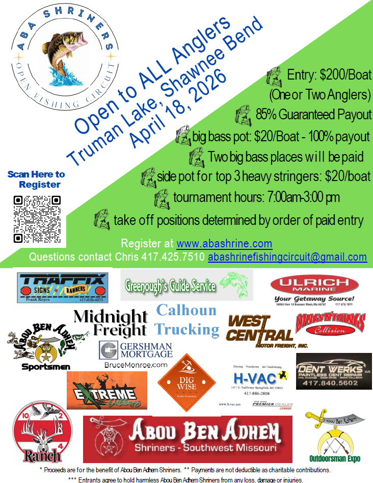 Get ready to hit the water for a great cause Saturday, April 18th at the ABA Shrine Open Fishing Circuit Tournament at Shawnee Bend, Truman Lake!
