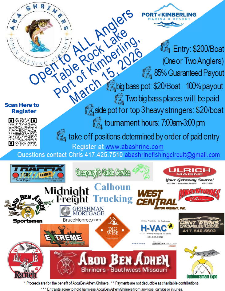 Get ready to hit the water for a great cause Sunday, March 15th at the ABA Shrine Open Fishing Circuit Tournament at Port of Kimberling Marina!