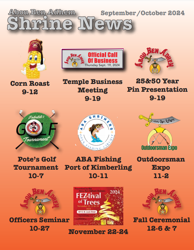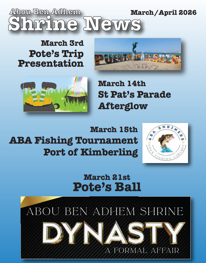 2026Shrine NewsClick Front of the Page To View Jan - Feb 2026 Shrine News March April 2026 Shrine News ABA Shrine News 2025 Jan Feb 2025 Shrine News March April 2025 May June 2025 July Aug 2025 Sept Oct 2025 Nov Dec 2025 ABA Shrine News 2024 January - February 2024 May - June 2024 July - August 2024 September - October 2024 November - December 2024 Shrine News 2023 January - February 2023 September - October 2023 March - April 2023 November-December 2023 May - June 2023 July - August 2023